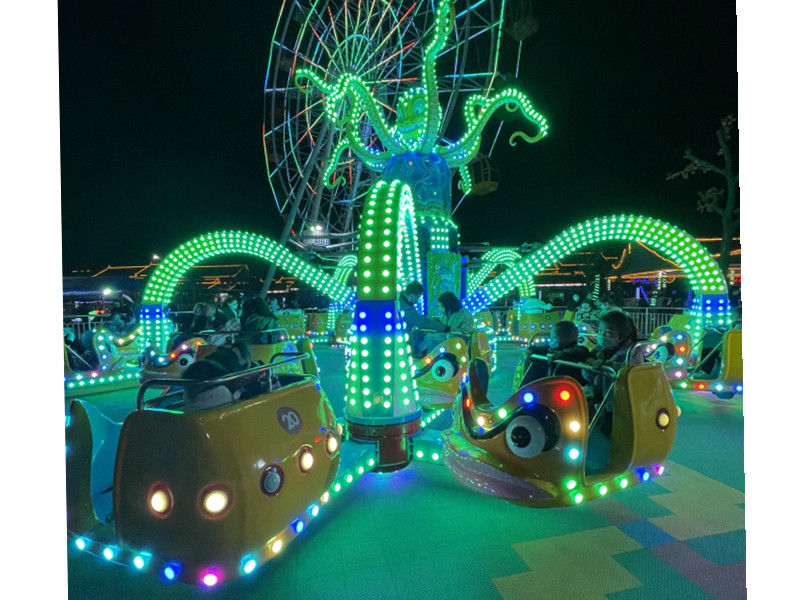 旋转大章鱼是种旋转类的中型游乐设备,属游乐场设备、公园游乐设备、室外游乐设备。形似章鱼,形似蛟龙,低起伏,随时而动,每个座椅可坐两个人。本游艺机是由电动机驱动,游客乘坐在玻璃钢座舱上完成旋转,升降运动。 工作原理: 游艺机由电动机通过减速机减速后传动,动力通过回转支承旋转运动,另个动力通过偏心结构来实现座舱的上下升降运动。设备运行后,能在规定的时间内停止。